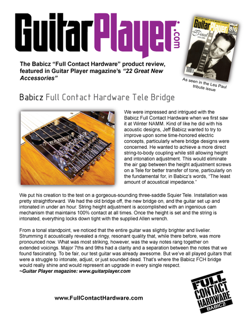 Today we are checking out Full Contact Hardware bridges by Babicz. Full Contact: The name alone makes me think my Strat might check me into the wall as I make my way to the kitchen for my Cheerios. Babicz is a popular US guitar maker that also produces guitar and bass bridges.