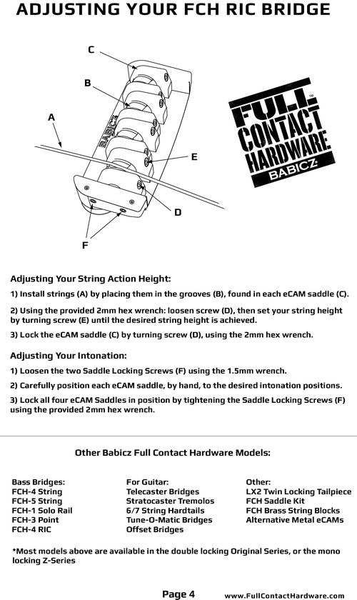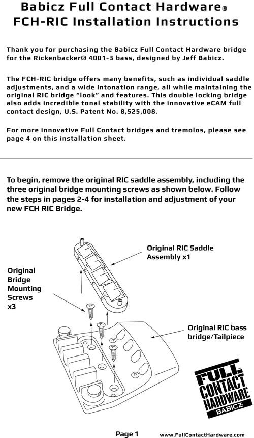 Thank you for considering the Babicz Full Contact Hardware® bridge for the *Rickenbacker® 4001-3 bass, designed by Jeff Babicz. The FCH-RIC bridge offers many benefits; such as individual string height adjustments, a wide intonation range, easy (and fully reversible) drop-in installation...all while maintaining the original RIC bridge “look” and features. This double locking bridge also adds incredible tonal stability with the innovative eCAM full contact design, U.S. Patent No. 8,525,008. Weight: 3.17 oz.