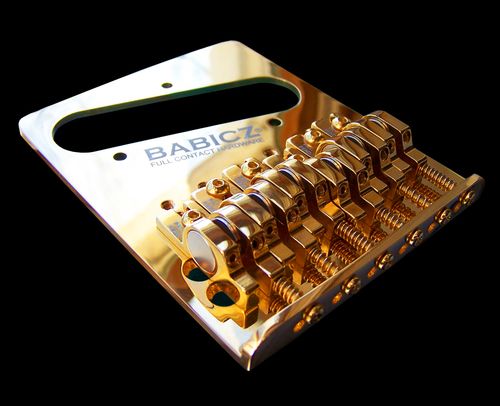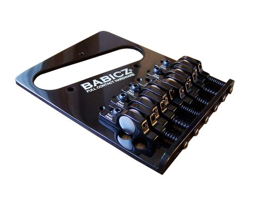 The "Full Contact Hardware" direct coupling system for "Telecaster" style bridges directly replaces the existing bridge, in either three or four hole mount systems. The "eCAM" saddle design means unwanted spaces between the bottom of the saddle and the top of the bridge plate are eliminated. The Babicz "Full Contact Hardware" replacement system for "Telecaster" style guitars offers unmatched stability, increased sustain, dramatically improved fullness and tone along with complete adjustability. Available in Chrome, Black Nickel, and Gold finishes.