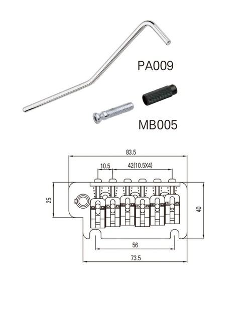 Fits American Fender Strats. Includes tremolo, springs, spring claw with screws, tremolo arm, pivot screws with body inserts, instructions, and 1.5mm adjustment wrench. Weight: 10 oz.